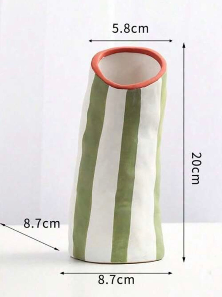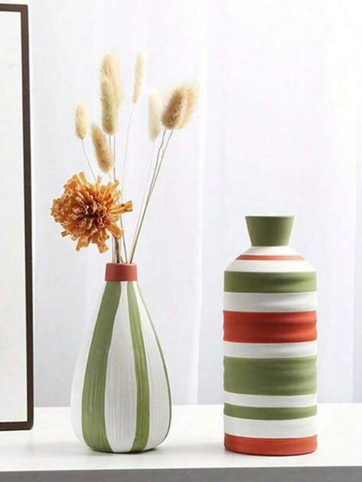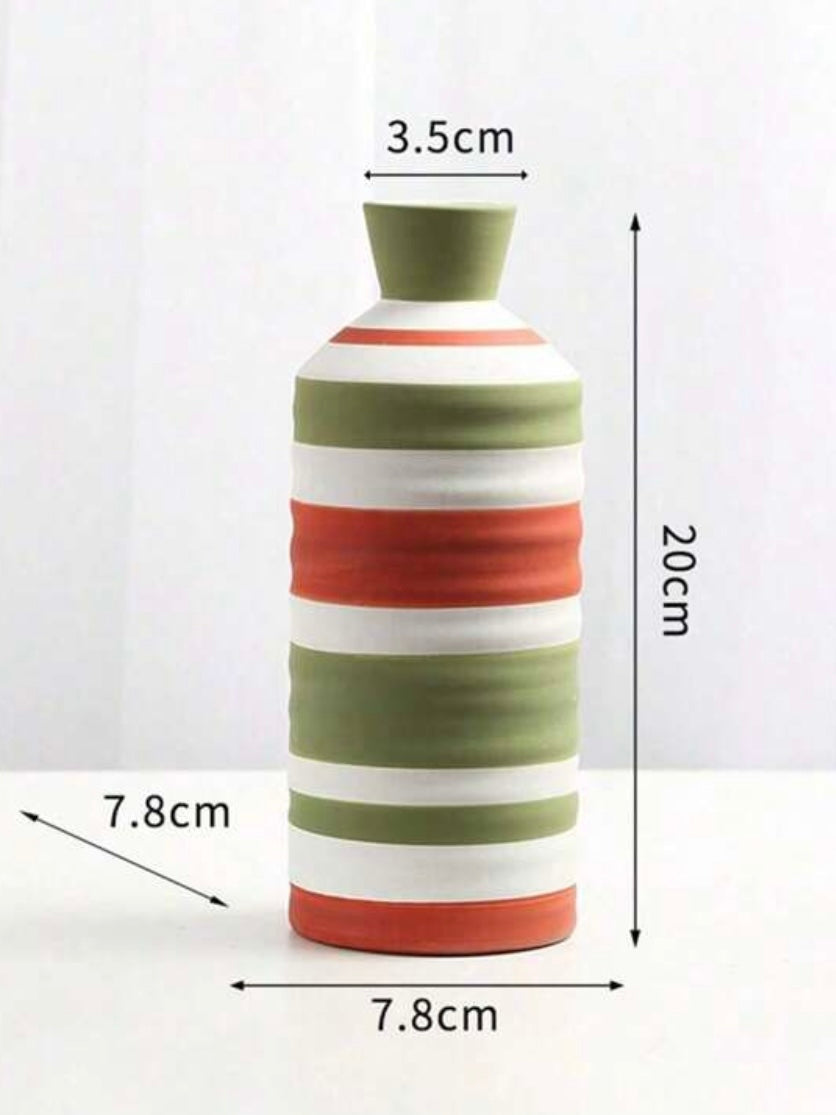 Inspired by the soft charm of Scandinavian design, the Aurora Vessels blend minimalism with hand-painted artistry. This trio of ceramic vases features clean vertical and horizontal stripes in earthy green, terracotta, and ivory tones — echoing the peaceful rhythm of Nordic landscapes. Each piece is uniquely shaped and perfectly imperfect, adding warmth, texture, and personality to any modern interior.